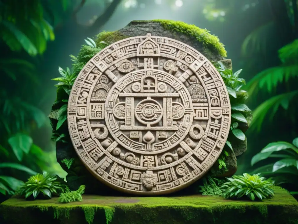 Detallada piedra del calendario Maya, bañada en luz cálida, revelando el significado de la Cuenta Larga