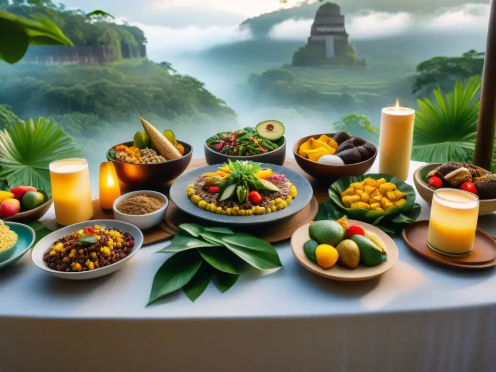 Festín maya con platos inspirados en la dieta de los dioses mayas, rodeado de vegetación exuberante y cerámica maya